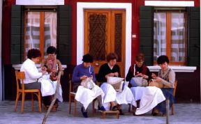 Burano. Merlettaie al lavoro in una strada di Burano.
