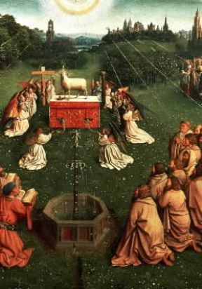 Hubert e Jan van Eyck. Adorazione dell'agnello, particolare del pannello centrale dell'altare di Gand, realizzato da entrambi i fratelli (Gand, St. Bavon).