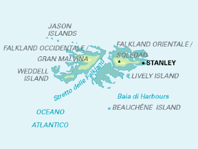 Arcipelago (12.173 km² o, secondo fonte argentina, 11.718 km²; 3000 ab. secondo una stima del 2003; capoluogo Stanley) dell'Oceano Atlanticomeridionale, 450 km ca. a E delle coste meridionali dell'Argentina e dello stretto di Magellano, compreso tra i 51° e i 53° di lat. S e i 57° e i 62° di longitudine W. . Appoggia sullo zoccolo continentale sudamericano ed è costituito da due isole principali, East Falkland (o Soledad) e West Falkland (o Gran Malvina) e da oltre 100 isolette minori (Weddell, Saunders, Pebble, Jason, Lively, ecc.). La morfologia delle isole è caratterizzata da pianure intervallate da basse catene montuose (monte Usborne, 684 m; monte Adam, 698 m) e da coste molto articolate. Il clima è oceanico, ma non molto rigido. L'allevamento ovino, bovino ed equino, la pesca, la caccia alla balena e l'esportazione di lana e pelli sono le principali risorse economiche degli abitanti.