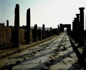 Roma. Le rovine romane di Timgad, l'antica Thamugadi, in Algeria. Il decumano massimo con l'arco di Traiano.