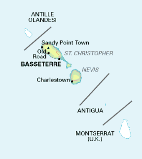Indice(Federation of Saint Kitts and Nevis). Stato dell'America Centrale (269,4 km²). Capitale: Basseterre. Popolazione: 41.000 ab. (stima 2008). Lingua: inglese (ufficiale), creolo-inglese. Religione: anglicani 33,3%, protestanti 28,2%, altri 38,5%. Unità monetaria: dollaro dei Caraibi Orientali (100 centesimi). Indice di sviluppo umano: 0,830 (60° posto). Confini: oceano Atlantico. Membro di: Commonwealth, OAS, ONU e WTO, associato UE.