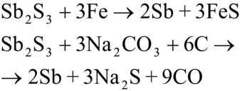 L'antimonio così ottenuto viene poi eventualmente raffinato per via elettrolitica. Il metallo puro fonde a 630,5 ºC, presenta un colore simile a quello dell'argento e uno splendore metallico; è assai fragile, tanto da poter essere facilmente polverizzato. All'aria, anche umida, si conserva inalterato alla temperatura ambiente; riscaldato a temperature elevate invece brucia con fiamma azzurrastra trasformandosi nell'ossido Sb2O3. È relativamente resistente agli agenti chimici, per esempio all'acido cloridrico e all'acido solforico diluiti; l'acido nitrico di media o di alta concentrazione lo attacca trasformandolo a seconda delle condizioni negli idrati degli ossidi Sb2O3 e Sb2O5. Oltre alla forma ora descritta e indicata col nome di antimonio grigio, l'unica di importanza pratica, l'antimonio presenta una modificazione allotropica gialla, stabile solo a temperatura molto bassa e simile nelle sue proprietà al fosforo giallo, e una forma allotropica nera, anch'essa instabile, amorfa e che tende a trasformarsi spontaneamente nella forma grigia. Esiste anche una quarta forma dell'antimonio, l'antimonio esplosivo, che non può essere però considerata come modificazione allotropica perché contiene piccole quantità di cloruro d'antimonio. L'antimonio esplosivo riscaldato a 100 ºC, o raschiato con uno spillo, esplode con notevole sviluppo di calore trasformandosi nella forma metallica stabile. Date le sue scadenti qualità meccaniche, l'antimonio metallico puro non ha alcuna applicazione pratica, mentre importanti impieghi trova in leghe, in particolare con il piombo e lo stagno. L'aggiunta di piccole percentuali di antimonio a questi elementi li indurisce notevolmente e ne migliora le altre proprietà meccaniche. La lega piombo-stagno al 10-20% di antimonio viene usata per batterie di accumulatori, per pallini da caccia, per caratteri da stampa e per metalli antifrizione (3-10% di antimonio). Con lo stagno l'antimonio forma leghe per oggetti di falsa argenteria (metallo Britannia, 14% di antimonio) e il peltro per posateria (69% di stagno, 17% di antimonio, 4% di rame).