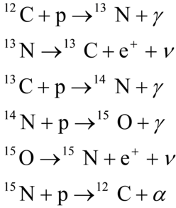Il carbonio 12 funge quindi da catalizzatore. L'altro processo con il quale viene prodotta energia all'interno delle stelle, anche questo studiato da Bethe, è il ciclo dell'idrogeno. Rispetto a questo il ciclo del carbonio richiede temperature di innesco superiori (10-12 milioni di gradi invece di 4-5 milioni di gradi), nonché la presenza di carbonio e azoto; per contro, a temperature superiori ai 20 milioni di gradi, l'efficienza del ciclo del carbonio è superiore a quella del ciclo protone-protone. Per questo motivo, nei nuclei delle stelle leggere della sequenza principale, essendo queste a temperature relativamente basse, l'energia viene generata principalmente tramite il ciclo protone-protone, mentre nelle stelle più pesanti, o, meglio, più dense, potrà compiersi anche il ciclo del carbonio nella zona centrale più calda e più ristretta; attorno a questa vi sarà una zona a temperatura inferiore, nella quale predominerà il ciclo protone-protone. Le reazioni di questo ciclo sono: