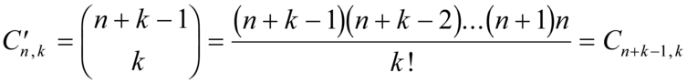 dove n! è il fattoriale di n. Si dice combinazione con ripetizione di n oggetti di classe k (o a k a k) ogni raggruppamento di k oggetti comunque scelti fra gli n assegnati, con la convenzione che ogni oggetto può essere ripetuto una o più volte; due combinazioni con ripetizione sono distinte quando differiscono per almeno un oggetto contenuto o per il numero di volte che un oggetto vi compare. Il numero k può essere anche maggiore di n. Il numero C', di tali combinazioni è uguale al numero delle combinazioni semplici di n+k–1 oggetti di classe k: