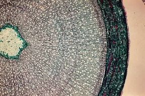 Fusto. Sezione trasversale di giovane fusto di pioppo: al centro sono visibili gli anelli di crescita e i raggi midollari, all'esterno il cambio, il libro e la corteccia.
