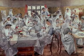Medicina. Infermiere in un ospedale durante la I guerra mondiale in un dipinto di J. B. Devis (Londra, National War Museum).