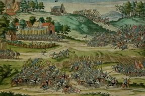 Protestantesimo. Incisione raffigurante lo scontro fra papisti e riformati avvenuto presso Cognac nel 1568 (Ginevra, Biblioteca Pubblica e Universitaria).