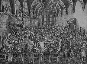 Protestantesimo. Una seduta della Dieta di Augusta (1530) in una stampa coeva: l'imperatore Carlo V assiste alla lettura della Confessione augustana (Parigi, Bibliothéque Nationale).