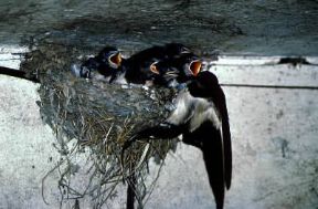 La Hirundo rustica raggiunge i 20 cm ca. di lunghezza ed è ben riconoscibile anche in volo per la coda forcuta, dovuta alle timoniere esterne lunghe e filiformi, più sviluppate nei maschi, e per le ali falciformi. Il piumaggio superiormente è blu scuro con riflessi metallici; la fronte e la gola sono rosse, con la porzione più bassa della gola blu scuro; le parti inferiori del corpo sono di un colore bianco crema. Il becco è breve e depresso, la testa appiattita che prosegue quasi indistintamente nel collo; le zampe brevi, con piccole dita, recano minuscole unghie. Gregaria, è una vera maestra del volo e sono note le sue caratteristiche di velocità e acrobaticità. La sua voce acuta si fa metallica e tintinnante quando l'animale è eccitato. Instancabile cacciatrice di insetti, che cattura a volo, la rondine frequenta di preferenza le campagne disseminate di cascine, stalle, costruzioni rustiche. Il nido, a forma di semicoppa, viene realizzato con fango e paglia in corrispondenza delle grondaie, nei camini, nelle stalle, sotto le tettoie, sotto i ponti, ecc. Le uova, bianche con macchiettature rossicce, vengono deposte in numero di 4-6 e schiudono in una quindicina di giorni; i piccoli vengono alimentati con straordinaria assiduità e regolarità dai genitori. Nel corso di un anno una coppia può dare luogo anche a tre covate successive. Vive in Europa e in Asia, effettuando, all'approssimarsi della stagione fredda, imponenti migrazioni in massa che la portano a sud sino all'Africa centrale e all'Asia meridionale. In Italia si sofferma da marzo-aprile sino a settembre-ottobre. La popolazione europea è andata progressivamente riducendosi, a causa di numerosi fattori tra cui l'uso di pesticidi e la ristrutturazione degli edifici rurali, che ha privato le rondini degli abituali luoghi per la nidificazione. La rondine rossiccia (Hirundo daurica), caratteristica dell'Europa sudorientale e dell'Asia occidentale, si distingue abbastanza facilmente per il groppone rossiccio, per la nuca e il sopracciglio castani, per la gola e le parti inferiori anch'esse rossicce. Inoltre le sue timoniere esterne sono meno lunghe e le punte delle ali meno acuminate rispetto alla precedente. La rondine montana (Ptyonoprogne rupestris), che vive nelle zone mediterranee montane e costiere caratterizzate da pareti rocciose con crepacci e anfratti, lunga ca. 15 cm, ha una struttura piuttosto massiccia, coda con biforcazione appena accennata e macchie in prossimità della punta. Ha il dorso bruno, è priva di banda pettorale e le sue parti inferiori sono bianche. Alcune popolazioni della rondine montana svernano in Italia anziché migrare a sud. La rondine a fronte bianca (Petrochelidon albifrons), propria del continente americano, si riconosce per la fronte bianca nonché per la coda breve e squadrata. Pure americana è la rondine porporina (Progne subis), caratterizzata dai riflessi porporini del piumaggio blu, nonché dalle dimensioni notevoli (è lunga ca. 20 cm con un'apertura alare di ca. 40 cm).