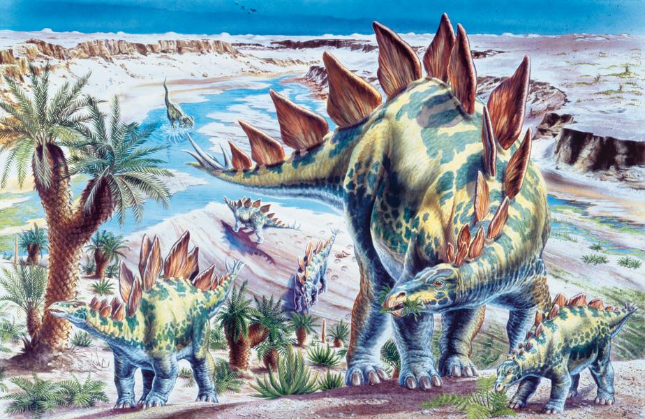 Il nome Stegosaurus, che significa "rettile con le tegole", si deve alle 17 piastre triangolari presenti sul dorso, alcune delle quali alte anche un metro; simili a foglie per la forma, erano disposte su 2 fi le sfalsate fi no a metà del dorso, lungo una sola fi la nella seconda metà. Stegosaurus, il rappresentante più grande della sua famiglia, aveva testa molto piccola, corpo tozzo e zampe anteriori più corte di quelle posteriori. L’estremità della robusta coda portava 2 paia di aculei e intorno al collo si notavano molteplici piccole placche ossee, utili a proteggere la gola dai morsi dei predatori. Il cranio accoglieva un cervello molto piccolo, del peso di circa 70 grammi, ma altri gangli nervosi, una sorta di piccoli "cervelli aggiuntivi", erano collocati in vari punti lungo il midollo osseo e servivano ad aumentare la velocità degli impulsi nervosi. Grazie a questo sistema, Stegosaurus era in grado di controllare con maggior precisione i movimenti delle zampe e della coda; l’animale si muoveva con andatura quadrupede nelle radure all’interno dei boschi, dove brucava la vegetazione.