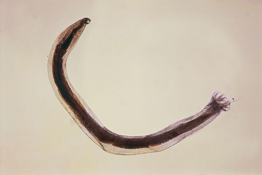 Ancylostoma duodenale è un nematode parassita dell’uomo e di altri mammiferi come Canidi e Felidi, che vive nell’area mediterranea e nelle regioni tropicali e subtropicali del Sudest Asiatico e dell’America Meridionale. Frequenta zone dal terreno umido e ben aerato, poiché l’ossigeno e una temperatura piuttosto elevata sono necessari al metabolismo delle uova. Di colore bianco-rosato, ha il corpo a forma di S e presenta una capsula boccale munita di acuminati dentini ripiegati verso l’interno. Il ciclo vitale si sviluppa in 7 fasi: dopo i primi stadi liberi, le larve perforano la pelle dell’ospite raggiungendo i polmoni e quindi l’intestino, dove si sviluppano cibandosi di sangue e si riproducono. L’infestazione da Ancylostoma duodenale (anchilostomiasi) è una patologia nota anche come anemia dei minatori, poiché un tempo colpiva in particolare i lavoratori del sottosuolo.
