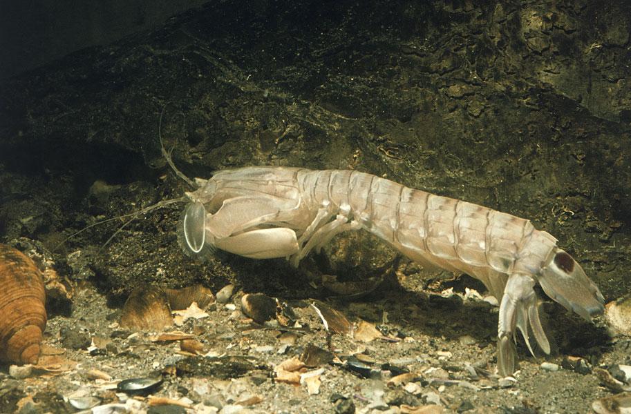 Nota anche come conocchia, pannocchia o cicala di mare per il suo tipico “verso”, la canocchia (classe Malacostraci) vive sui fondali sabbiosi e fangosi del mar Mediterraneo fino a 100 metri di profondità. Si riconosce per le 2 grosse chele dotate di spine, che utilizza per uccidere le prede; in posizione di riposo queste “pinze” sembrano braccia unite in preghiera e ricordano le mantidi (da cui deriva il nome specifico di questo crostaceo). La canocchia ha corpo slanciato di colore chiaro, con riflessi madreperlacei; alla base del telson (l’ultimo segmento toracico) si notano 2 grandi macchie scure. La canocchia vive prevalentemente dentro tane che scava nel fango o nella sabbia, dalle quali tende agguati alle sue prede; si nutre di invertebrati marini e talvolta di qualche pesce, che cattura con una rapida estensione degli arti. Le femmine portano le uova con sé fino alla schiusa, trattenendole solitamente fra le zampe toraciche anteriori e rimescolandole frequentemente. Le uova si schiudono a uno stadio immaturo e le larve si trasformano in adulti dopo un periodo di vita planctonica che può durare anche 3 mesi.