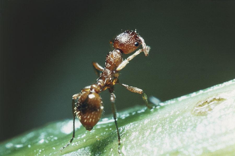 Presente in Europa, Caucaso, Siberia e Nordamerica, la formica rossa è diffusa anche in Italia. Così chiamata per la colorazione rossastra della parte superiore del corpo, vive nei boschi, dove costruisce enormi monticelli (detti acervi) con aghi di conifere, rametti o foglie al di sopra del proprio nido sotterraneo; un nido può raggiungere l’altezza di un metro e contare da 500 000 a un milione di individui. Dotata di grandi mandibole, la formica rossa è priva di pungiglione ma può lanciare fino a 30 centimetri di distanza potenti getti di acido formico, che produce a livello dell’addome. Quest’arma chimica serve sia per cacciare sia per difesa; nell’uomo può avere effetto irritante. Nella società della formica rossa si differenziano 3 caste: operaie, maschi e femmine riproduttrici. Le prime costituiscono la maggior parte della popolazione e svolgono svariati compiti, da quello di nutrire la regina alla manutenzione del nido, dall’approvvigionamento del cibo alla cura di uova e larve, alla difesa dagli intrusi. Le femmine fertili (regine) all’inizio sono provviste di ali; in primavera vengono fecondate dai maschi, quindi si portano a terra, perdono le ali e depongono le uova. Da queste nasceranno le operaie, indispensabili per fondare un nuovo nido o una nuova colonia in un nido già esistente. I maschi invece dopo l’accoppiamento hanno vita breve. La differenziazione in caste è controllata da fattori come la temperatura di deposizione delle uova, il tipo di nutrizione larvale, il numero di operaie e la presenza di regine.