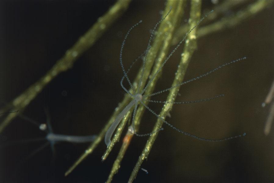 L’idra verde (classe Idrozoi) vive nelle acque dolci fissata al substrato o alla vegetazione subacquea. Il corpo è un peduncolo cilindrico dotato di disco adesivo all’estremità inferiore, con alcuni tentacoli a circondare l’apertura boccale nella parte superiore. Il tipico colore verde si deve alle zooclorelle, alghe simbionti unicellulari del genere Chlorella. L’idra verde cattura le prede - per lo più piccoli crostacei - con un filamento spinoso contenuto negli cnidoblasti e si riproduce gemmando nel peduncolo nuovi individui, che si staccano e cominciano a vivere per conto proprio. In virtù di queste capacità rigenerative a getto continuo, l’idra è, per così dire, "immortale": dal centro di produzione cellulare, disposto ad anello intorno ai tentacoli, le nuove cellule si spostano verso la base del peduncolo, che le riassorbe. In questo modo l’animale sostituisce tutte le cellule in poche settimane, e di fatto non invecchia mai. Altre idre sono quelle dei generi Hydra, Pelmatohydra e Cordylophora.