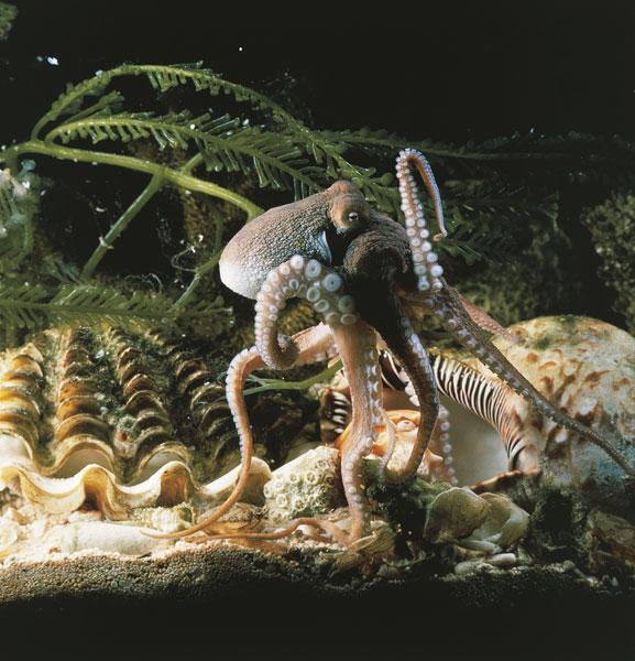 Detto anche piovra, il polpo vive sui fondali lungo le coste rocciose del Mar Mediterraneo e dell’Oceano Atlantico nel settore europeo. Ha corpo grosso e globoso, che in casi eccezionali può raggiungere una lunghezza complessiva di 3 metri e un peso di 20 chilogrammi. Completamente ricoperto di tubercoli, è inconfondibile con le sue 8 lunghissime braccia tentacolari munite di ventose; di colore grigiastro con chiazze chiare o brunastre, ha un’elevata capacità mimetica, e riesce a variare la propria colorazione a seconda del fondale su cui si trova. Pur muovendosi velocemente, questo grande mollusco non ama spostarsi dal suo rifugio - di solito un anfratto naturale - ed esce allo scoperto solo se viene disturbato. Abilissimo predatore, si nutre di pesci, crostacei e altri polpi, che attende nascosto nella propria tana o mimetizzato tra le rocce. Dopo aver individuato la vittima, la immobilizza con il secreto paralizzante delle ghiandole salivari, poi la trasporta nella propria tana tenendola fra i tentacoli e infine la divora lentamente, facendola a pezzi con il robusto becco. Il polpo è in grado di apprendere rapidamente, è dotato di memoria ed è uno degli invertebrati più intelligenti.