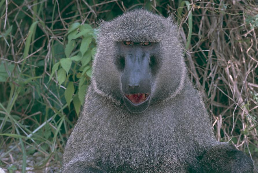 Questo grande babbuino vive nell’Africa centrorientale, in parte dell’Africa occidentale e nelle zone meridionali e periferiche del Sahara. Si ritrova in svariati ambienti naturali quali la savana, la steppa e persino le aree desertiche. Le differenze tra i sessi sono spiccate: il maschio pesa circa 25 chilogrammi – quasi il doppio delle femmine –, possiede una folta criniera e canini molto sviluppati. Il mantello è lungo e ha una colorazione tra il grigio-olivastro e il brunastro; alla nascita è nero. L’anubi vive a terra e forma gruppi di 30-100 individui dotati di complessa struttura sociale. La dieta include frutti, insetti, uova, semi, fiori, erba, radici e piccoli vertebrati.
