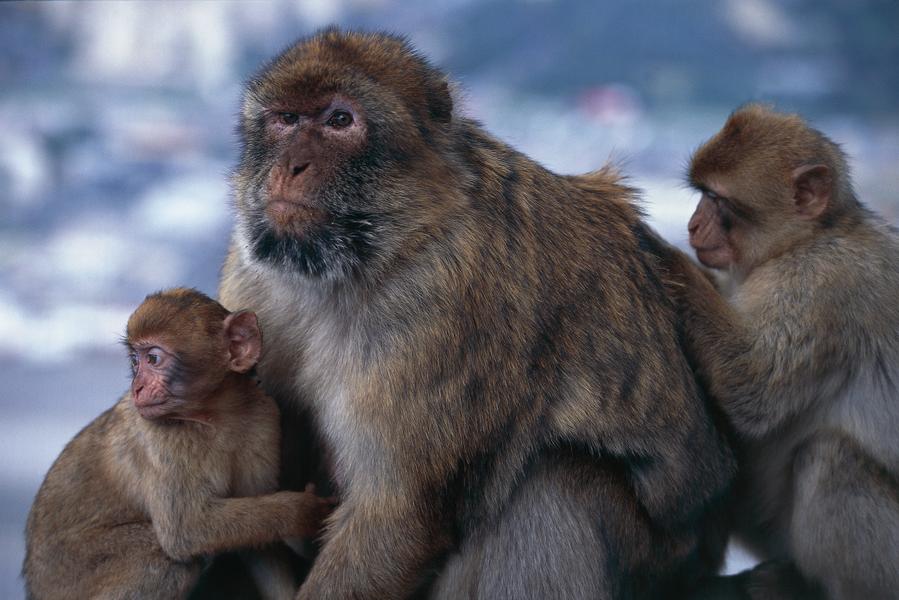 Detta anche scimmia di Barberia, la bertuccia è l’unica scimmia del genere Macaca che vive fuori del continente asiatico. È presente nei boschi di querce e cedri in Algeria, Marocco e Tunisia, di preferenza a quote medio-alte, ed è inoltre l’unica scimmia europea: la sua presenza, sebbene modesta, è accertata a Gibilterra (Penisola Iberica), dove ci sono 2 popolazioni, una semidomestica e una selvatica, che vivono in modo relativamente indipendente l’una dall’altra. La bertuccia è una delle specie più grandi del suo genere ed è caratterizzata da corporatura tarchiata, testa grossa, tronco robusto e assenza di coda. Il viso è nudo e biancastro, mentre il resto del corpo è coperto da un folto mantello bruno-giallastro, che diventa bruno scuro sul capo e giallo chiaro sul ventre. Le mascelle sono potenti, dotate di lunghi canini. Rispetto alla maggior parte delle scimmie, risente molto meno delle avverse condizioni atmosferiche e climatiche, ed è assai resistente sia al caldo sia, soprattutto, al freddo. Di indole socievole, costituisce gruppi di 10-40 individui e vive prevalentemente a terra, dove si muove con grande agilità, nonostante l’aspetto tozzo. Si nutre di frutti, foglie, semi, fiori, tuberi e piccoli invertebrati; spesso si spinge negli orti e nei campi coltivati per far razzia di cibo.