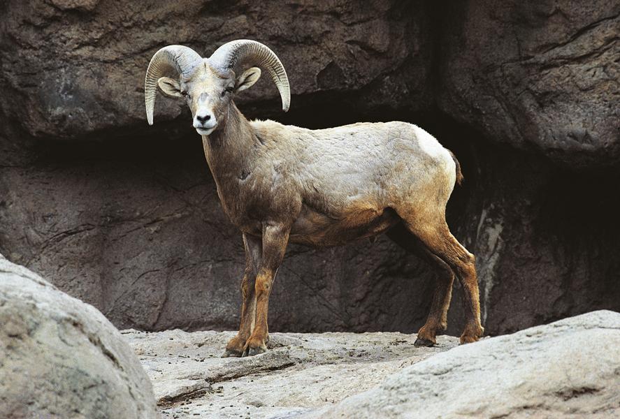 Il bighorn vive sulle Montagne Rocciose, tra le praterie d’alta quota, le pendici montane e i dirupi, spostandosi dagli 800-1500 metri d’inverno ai 1800-2500 in estate. Ha corporatura massiccia (può raggiungere i 127 kg di peso) e mantello liscio, di colore bruno scuro nelle parti superiori e biancastro sul resto del corpo. Le corna sono imponenti e a forma di spirale nei maschi, più corte e quasi diritte nelle femmine. Prevalentemente diurno, il bighorn si ciba di diverse varietà di erbe. Di abitudini gregarie, vive per lo più in gruppi di 8-10 soggetti, ma talvolta forma branchi di oltre 100 individui. È poligamo, e a volte il maschio manifesta comportamenti di tipo omosessuale, con il dominante a svolgere il ruolo del corteggiatore e il subordinato a interpretare il ruolo della femmina corteggiata.