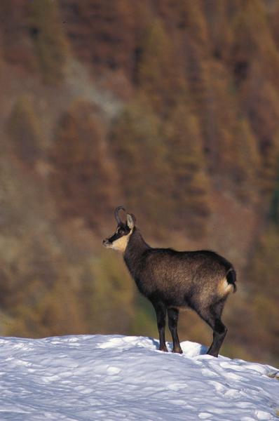 Il camoscio alpino è presente su gran parte delle Alpi, sugli Appennini, sui Pirenei, sui monti delle Asturie (Spagna), in diversi massicci dell’Europa orientale, in Asia Minore e nel Caucaso. Vive in montagna, dalle quote più basse (700-1500 m) ai 3000 metri, in aree sia aperte sia intensamente boscate, fino alle praterie d’altitudine. Alto 70-80 centimetri, pesa da 25 a 45 chilogrammi. Le corna dei maschi, a forma di grosso uncino, sottili e ricurve all’estremità, misurano 22-30 centimetri; quelle delle femmine, più sottili, possono essere anche più lunghe. Il mantello è marroncino d’estate e quasi nero d’inverno. Di eccezionale forza e resistenza, il camoscio è perfettamente adattato alla vita in montagna. Ha zoccoli con margini duri e taglienti in grado di fornirgli un solido appoggio sulle asperità delle rocce e sul ghiaccio; la suola plantare elastica gli consente una buona aderenza alle superfici rocciose. Inoltre le due metà degli zoccoli anteriori possono divaricarsi fino a formare un angolo di 90 gradi, il che, insieme agli “speroni” cornei situati sul retro delle zampe, gli impedisce di scivolare quando corre sui ripidi pendii erbosi o sulla neve. I tendini e le ossa degli arti sono robustissimi; cuore e polmoni sono particolarmente sviluppati. La dieta muta con le stagioni: d’inverno comprende licheni, muschi e germogli di conifere; in estate è basata prevalentemente su fiori ed erbe. I maschi adulti vivono per lo più isolati o in piccoli gruppi, mentre le femmine guidano i branchi più numerosi, di cui fanno parte anche i piccoli e pochi maschi giovani.