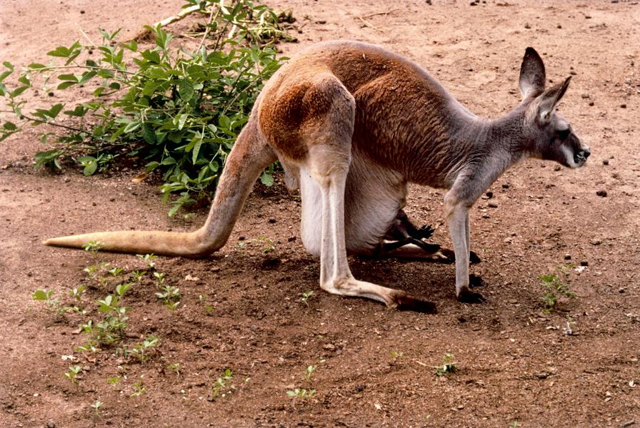 Il canguro rosso vive in branchi numerosi in vaste aree dell’Australia, sia nelle zone aride sia nelle praterie e nella macchia. Presenta struttura corporea imponente – può arrivare ai 90 chilogrammi di peso – e coda lunga circa un metro; il mantello è a pelo corto, rossiccio nei maschi e grigio-bluastro nelle femmine. La testa è piccola rispetto al corpo e, come nel canguro grigio, gli arti posteriori sono molto più muscolosi e sviluppati di quelli anteriori perché diversa è la loro funzione. Gli arti posteriori, infatti, servono per compiere i lunghi e caratteristici salti, mentre quelli anteriori sono impiegati per raccogliere il cibo e portarlo alla bocca. Le zampe degli arti posteriori, inoltre, sono dotate di un robusto unghione che il canguro rosso utilizza come arma di difesa e con cui è in grado di sventrare con un solo colpo animali della taglia di un grosso cane e all’occorrenza anche un uomo. Il suo principale nemico, in effetti, è proprio l’uomo, che ne utilizza la pelle per ricavarne borse, calzature e cinture. Di indole timida e solitaria, il canguro rosso ha abitudini erbivore; di solito pascola di notte, mentre di giorno si rifugia in una cavità o si adagia nelle depressioni del terreno.