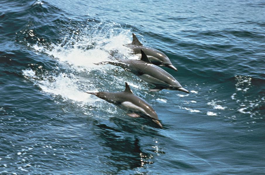 Il delfino comune è presente in tutti i mari, ma predilige quelli caldi come il Mar Nero, il Mar Mediterraneo e il Mar Rosso, oppure le acque costiere. Di forma spiccatamente idrodinamica, ha corpo nerastro con sfumature verdastre nella parte superiore e biancastro nelle parti inferiori, mentre sui lati presenta alcune larghe strisce bruno-giallastre. Dispone di 160-200 denti conici distribuiti su tutto il rostro. Con le sue “capriole” fuori dall’acqua e le sue doti di nuotatore (può raggiungere velocità di 35 o anche 50 chilometri orari), il delfino ha da sempre affascinato marinai e viaggiatori. Di notevole intelligenza, ha un cervello particolarmente voluminoso e complesso che gli conferisce un’eccezionale capacità di apprendimento. Non solo: è anche in grado di modulare una vasta gamma di suoni, di usare insomma un vero linguaggio articolato. È un animale socievole e vive in gruppi numerosi che possono comprendere anche migliaia di unità, in cui gli adulti si aiutano l’un l’altro e insegnano ai giovani. Ama le manifestazioni di affetto e il gioco, si comporta in modo solidale ed esprime forti emozioni nei confronti dei suoi simili. Caccia in gruppo, e si nutre di pesci e cefalopodi. Come tutti gli Odontoceti, possiede un sofisticato sistema di ecolocalizzazione, un vero e proprio “sonar”, grazie al quale è in grado di orientarsi e di individuare sia gli ostacoli sia le prede. Dopo una gestazione di 10 mesi, le femmine danno alla luce un piccolo ogni anno con cui instaurano un legame particolarmente intenso. Nelle acque costiere tropicali e temperate vive Delphinus capensis, che si distingue dal delfino comune per avere il rostro più lungo.