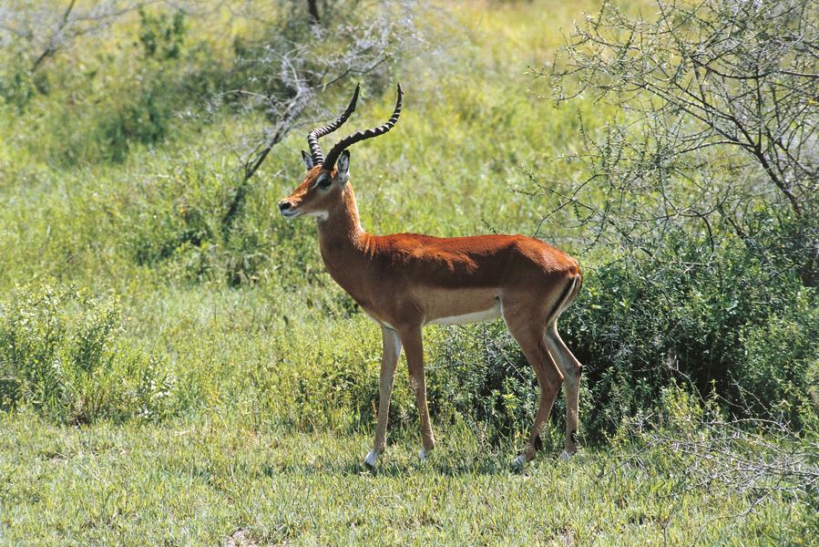 Presente nelle savane dell’Africa orientale e centromeridionale, l’impala ha corporatura snella (il peso si aggira sui 45-60 kg) e pelo fulvo rossastro vivo, più pallido sui fianchi e biancastro nelle parti inferiori; la parte posteriore alta delle cosce è percorsa da una striscia nera verticale. Le corna, presenti solo nei maschi, sono lunghe e a forma di lira. Gli impala formano branchi di 2 tipi. Il primo è composto da numerose femmine accompagnate dalla prole e da un solo maschio, che vigila affinché il branco non si disperda e aggredisce i maschi che tentano di introdurvisi. Il secondo raggruppa i maschi adulti non dominanti e i giovani; in questo tipo di branco vige completa indipendenza, ma il vantaggio della protezione reciproca tiene uniti i componenti. I piccoli nascono dopo circa 6 mesi di gestazione; per molti giorni la madre divide il suo tempo fra la cura della prole e il pascolo, per il quale non si allontana mai troppo. Oltre alla vista acutissima, per sfuggire ai predatori gli impala possono sfoderare un’arma di difesa alquanto insolita: si lanciano in una corsa apparentemente disordinata, che comprende balzi lunghi diversi metri e alti fino a 3. Questo saltellio frenetico disorienta il predatore, che vede davanti a sé addomi bianchi schizzare in tutte le direzioni e fatica a puntare una preda specifica. Tuttavia il branco non si disperde, poiché ciascun soggetto ha nella striatura nera che fiancheggia la coda del consimile un sicuro punto di riferimento.