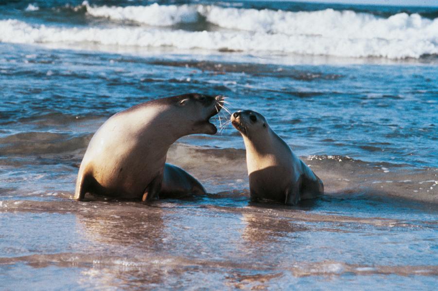 Il leone marino australiano è presente ormai solo lungo le coste meridionali dell’Australia ed è a rischio di estinzione. Cacciato a lungo per la pelle e l’olio, è oggi minacciato soprattutto dalla pesca con le reti, in cui spesso resta impigliato. I maschi, oltre che per il considerevole peso, che può raggiungere anche i 400 chilogrammi, si distinguono per la criniera giallognola e per il capo e il tronco di colore bruno scuro. Le femmine sono più piccole, di colore giallognolo nelle parti inferiori e bruno scuro in quelle superiori. Durante il periodo riproduttivo, che va da ottobre a dicembre, il leone marino australiano ingaggia aspre contese per crearsi un harem personale di 3 o più femmine. A differenza di altri pinnipedi, che nella stagione degli amori sono così concentrati sulla difesa del territorio da non trovare il tempo per sfamarsi, non dimentica mai il suo appuntamento con il pasto quotidiano. Una specie affine è Neophoca hookeri, tipica dei mari della Nuova Zelanda meridionale.