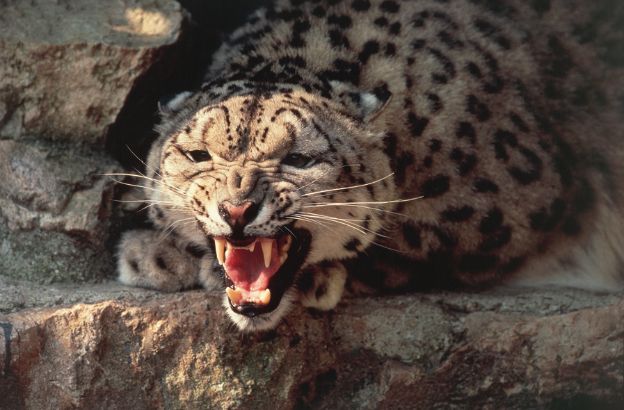 Endemico delle alte montagne del Tibet, il leopardo delle nevi (o irbis) presenta un folto mantello grigiastro lievemente tinto di crema, con macchie scure a rosette irregolari. La lunga coda (80-100 cm) ha anche una funzione protettiva: nei freddi inverni himalayani il leopardo delle nevi la arrotola attorno al muso usandola come “sciarpa”. Di abitudini notturne e incredibilmente elusivo, rimane in genere oltre il limite della vegetazione arborea, in ambiente roccioso; in estate si spinge anche fino a 6000 metri d’altitudine. Il folto e caldo mantello gli consente infatti di sopportare temperature rigidissime, e le ampie piante dei piedi fungono da racchette per non sprofondare nella neve. Si nutre di pecore selvatiche, lepri, uccelli e, quando d’inverno scende verso valle, non è raro che aggredisca il bestiame domestico. Data la scarsità di prede, ogni individuo dispone di un territorio di caccia assai esteso. Il periodo riproduttivo cade sul finire dell’inverno; dopo una gestazione di un centinaio di giorni la femmina dà alla luce da 2 a 4 piccoli, che alla nascita hanno un mantello molto scuro. In seguito all’indiscriminata caccia praticata per la sua pregiata pelliccia, oggi il leopardo delle nevi è assai raro.