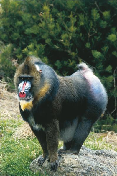 Presente nelle foreste dell’Africa centroccidentale (Nigeria e Camerun settentrionale), il mandrillo ha testa voluminosa, muso grosso e prominente e arti anteriori più lunghi di quelli posteriori. Il mantello di pelo rado e ispido è bruno-verdastro sul dorso e sui fianchi, giallognolo sul petto e biancastro sul ventre; è presente una marcata barba di colore giallo intenso. Assai caratteristico è il muso dei maschi, che presenta una serie di grossi solchi arcuati longitudinali coperti di pelle rossa, all’estremità dei quali si aprono le narici; il rosso dei solchi contrasta con l’azzurro delle guance, per cui il muso del mandrillo assomiglia a una vera e propria maschera. Una vivace colorazione rossiccia è presente anche sulle natiche, dove la pelle è nuda e non coperta di pelo. I canini del maschio sono assai sviluppati e assomigliano a vere e proprie zanne. Il mandrillo vive prevalentemente al suolo, ma sale sugli alberi per il riposo notturno; forma piccoli gruppi, che occasionalmente possono arrivare a 50 individui, guidati da un maschio dominante. Si ciba soprattutto di frutti e radici, ma non disdegna insetti, vermi e piccoli vertebrati.