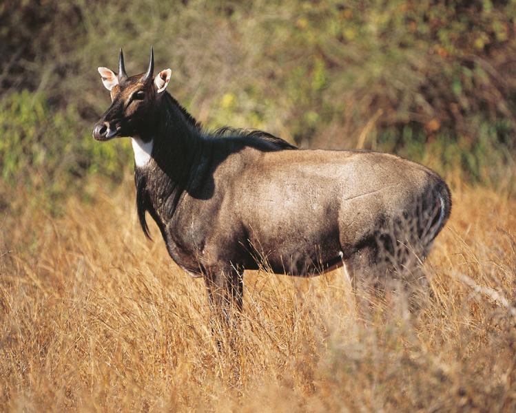 Tipico dell’India, dove è presente in tutta la penisola, il nilgau vive allo stato selvatico in savane ricche di cespugli o steppe con boschi e ampie radure. Letteralmente il suo nome significa “vacca azzurra”, a causa del colore grigio-azzurrognolo del manto dei maschi, diverso da quello giallo-marrone delle femmine. Una macchia bianca sulla gola forma una sorta di “bavaglio”, sotto il quale i maschi presentano un ciuffo di lunghi peli simile a una barba. Questo ungulato dalle forme piuttosto curiose ha corna molto piccole, assenti nelle femmine, e corporatura massiccia (può superare i 200 kg di peso); le zampe anteriori, più lunghe di quelle posteriori, gli conferiscono un particolare profilo obliquo. Il nilgau vive in gruppi composti abitualmente da una decina di individui. Maschi e femmine rimangono separati fino alla stagione degli amori; dopo una gestazione di 8-9 mesi nascono 1-2 piccoli. Per breve tempo la femmina vive quasi isolata o con un’altra neomamma; al raggiungimento dell’anno d’età le aggregazioni si fanno più ampie e riuniscono un gran numero di femmine adulte. In India il nilgau è anche addomesticato e venerato come sacro dalla popolazione.