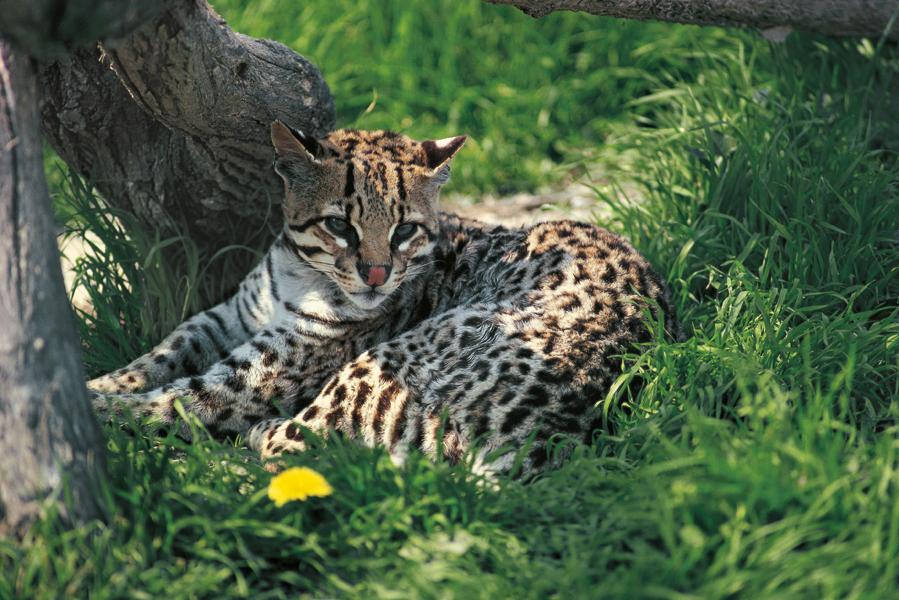 Presente nell’America centromeridionale fino al nord dell’Argentina, dove abita zone cespugliose e foreste, l’ocelot è detto anche gattopardo americano. Ha tronco robusto, testa grande, occhi dall’iride brunastra, orecchie corte e arrotondate, arti molto forti e di media lunghezza, coda lunga da 30 a 40 centimetri. La sua fama è dovuta principalmente all’elegante mantello, fitto e raso, a fondo grigio-bruniccio o grigio-rossiccio, con macchie ovali o tondeggianti irregolari e larghe strisce longitudinali su capo, collo, dorso, fianchi e coda. Proprio questa pregiata pelliccia lo ha reso oggetto di un’indiscriminata caccia che ne ha decimato la popolazione. Ottimo arrampicatore, si nutre soprattutto di piccoli vertebrati. Emana un odore forte e sgradevole, di cui si serve per segnare i percorsi preferiti e per orientarsi nel suo territorio. Il gatto delle Ande (Leopardus jacobitus) è un felino assai raro e a rischio di estinzione.