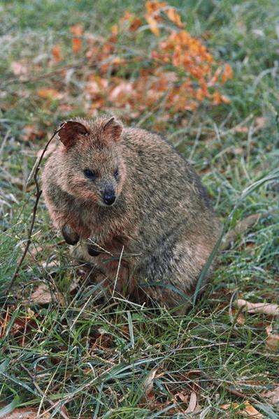 Conosciuto anche come wallaby dalla coda corta, il quokka è uno dei più piccoli wallaby e vive nell’Australia sudoccidentale (dove sta diventando molto raro) e in alcune isole vicine alla costa, in particolare le isole di Rottnest e Bald. Caratterizzato da una grande capacità di adattamento, si può incontrare in svariati ambienti naturali, anche se predilige le zone a folta vegetazione, nella quale apre a balzi delle vere e proprie gallerie. Questo piccolo canguro, che arriva a pesare solo 4 chilogrammi, è coperto di un mantello bruno e ha coda corta e assai poco muscolosa, che quindi non può utilizzare come punto d’appoggio. Il quokka costituisce gruppi familiari con una gerarchia dominata dal sesso maschile, ma è scarsamente territoriale. Di abitudini notturne, si nutre essenzialmente d’erba.
