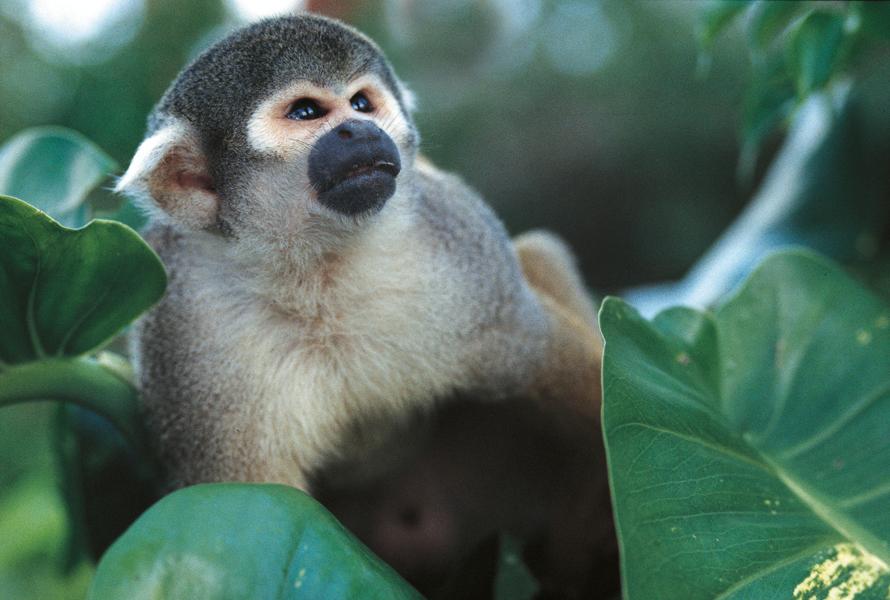 Detto anche scimmia scoiattolo, il saimiri scoiattolo vive nelle foreste dell’America Meridionale, di preferenza dove esistono abbondanti approvvigionamenti d’acqua. Il morbido mantello a pelo corto presenta colorazione grigio-nera sul capo e giallo-nera sul tronco; la coda è lunga quanto il corpo. La testa ha un caratteristico profilo ovale, e intorno alla bocca e alle narici spicca una vistosa macchia nera con bordi bianchi: a causa di questa maschera caratteristica il saimiri è chiamato talora con il macabro nome di testina di morto. Dotato di grande agilità, vive sugli alberi in gruppi numerosi che possono arrivare ai 300 individui, in cui il ruolo dominante spetta alle femmine. Ha abitudini diurne e si ciba soprattutto di frutti e insetti, talora di foglie e semi.