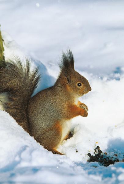 Lo scoiattolo europeo, o scoiattolo comune, è un roditore arboricolo che frequenta i boschi di conifere e latifoglie dell’Europa e dell’Asia settentrionale, spingendosi fino a 2000 metri di quota. Vero folletto dei boschi, è dotato di un fisico minuto, elegante e flessuoso che gli conferisce una notevole agilità. Caratteristiche sono le orecchie con un ciuffo di peli all’apice, la vistosa coda, folta e lunga quanto il resto del corpo, e le zampe posteriori che, più sviluppate delle anteriori, imprimono la spinta ai suoi lunghi salti. Il mantello può essere rossiccio, ma presenta grandissima variabilità. Di abitudini diurne, lo scoiattolo si nutre di frutti, semi e gemme, e in alcuni casi preda le uova degli uccelli o i loro nidiacei. Si costruisce un nido nelle cavità dei tronchi degli alberi o fra i rami, oppure occupa rifugi abbandonati. D’inverno non va in letargo, ma trascorre lunghi periodi di sonno che alterna a momenti di intensa attività alla ricerca di cibo. Tende a vivere solitario, eccetto che nel periodo riproduttivo. La gestazione dura 38-39 giorni e la femmina partorisce in genere 2 volte all’anno, dando alla luce 3-6 piccoli. I nuovi nati hanno la pelle nuda e sono ciechi e sordi; aprono gli occhi dopo 30 giorni, e a 45 escono per la prima volta dal nido. La piena indipendenza arriva a 8-10 mesi, seguita entro l’anno dalla maturità riproduttiva.