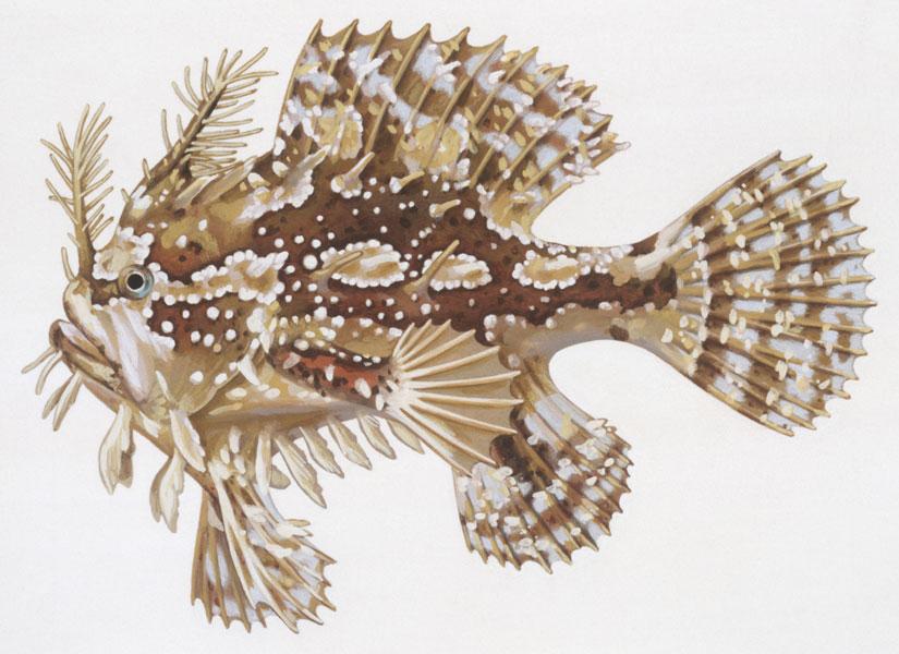 L’arlecchino dei Sargassi è presente nelle enormi "praterie" formate dalle gigantesche alghe che proliferano nel Mar dei Sargassi. Di aspetto veramente singolare, ha corpo tozzo e testa piccola, schiacciata, con la mandibola più prominente della mascella. La pelle è priva di scaglie, ma provvista di numerose espansioni, pieghe e protuberanze sparse un po’ dovunque; digitazioni sono presenti anche sulle pinne, ad esclusione di quella caudale, che un lungo peduncolo unisce al corpo. Le pinne pettorali sono prensili e servono da appoggio per "camminare" sul fondo. Il mimetismo è una componente fondamentale nella morfologia dell’arlecchino dei Sargassi: la sua colorazione a chiazze giallastre con marmorizzazioni brune lo rende perfettamente mimetico nel suo ambiente, dove il gioco mutevole di luci e ombre è fortissimo.