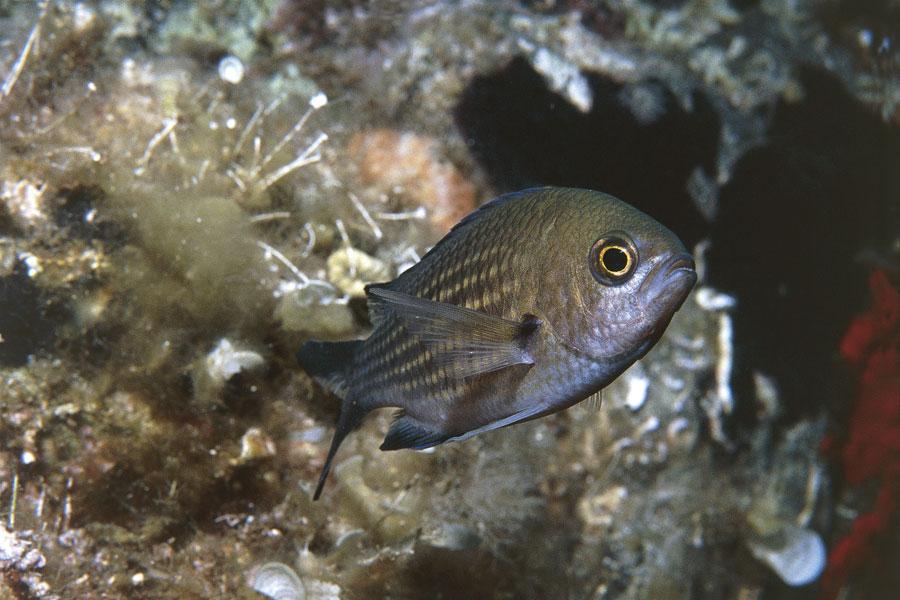 La castagnola è l’unica rappresentante mediterranea dei Pomacentridi. Di modeste dimensioni, vive in banchi vicino alle coste con fondali rocciosi. Si incontra anche nella fascia temperata dell’Oceano Atlantico occidentale. Presenta la conformazione tipica della sua famiglia, con corpo tondeggiante, assai compresso in senso laterale, e una livrea nettamente diversa nei giovani - dove è di un blu intenso arricchito da riflessi azzurro-metallici - rispetto agli adulti, nei quali è color bruno-seppia dai riflessi dorati. La castagnola è una specie sedentaria, che ama vivere in prossimità del fondo, dove si aggira instancabilmente alla ricerca di piccole prede. Il maschio è il custode delle uova, che la femmina depone all’inizio dell’estate e fissa a una roccia.