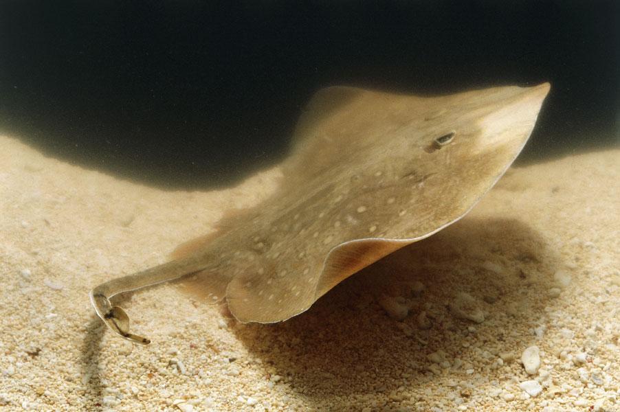 La razza stellata vive nel Mar Mediterraneo e, in minor misura, nell’Oceano Atlantico orientale, in particolare lungo le coste meridionali del Portogallo, sui fondali sabbiosi fino a 100 metri. Il corpo, biancastro sul ventre e per il resto giallo-olivaceo con fitte macchioline brune e giallastre, è depresso e diviso in 2 parti: il cosiddetto disco, di forma romboide, che rappresenta un tutt’uno di capo, tronco e pinne pettorali, e la coda, lunga e sottile. La pelle è zigrinata e presenta alcune file longitudinali di spine su coda e dorso; sui lati della coda, in una piega cutanea, sono localizzati organi elettrici che producono scariche a basso potenziale. Il muso è corto e appuntito, e la bocca è ventrale e dotata di diverse file di denti. Gli occhi sono sul dorso e dietro mostrano ampi fori (spiracoli), che servono a introdurre l’acqua durante la respirazione. Le razze, infatti, non introducono l’acqua dalla bocca perché, vivendo sul fondo del mare, insieme all’acqua introdurrebbero anche melma e sabbia. Pur essendo un’agile nuotatrice, la razza stellata sta per lo più immobile nella sabbia e si ciba di animali di fondo come crostacei, molluschi e teleostei. Ovipara, depone le uova sul fondale, protette da un robusto guscio corneo. Specie molto simile è la razza maculata (Raja montagui), presente sui bassi fondali sabbiosi di Mar Mediterraneo, Mar Nero e Oceano Atlantico orientale fino all’altezza del Marocco.