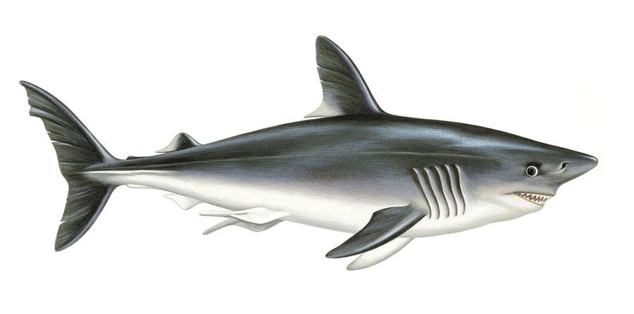 Detto anche squalo nasuto, lo smeriglio è uno degli squali più aggressivi e pericolosi per l’uomo e vive in tutti gli oceani, nel Mar Mediterraneo e nel Mar Nero, in acque in cui la temperatura sia di 1-18 °C e fino a una profondità di 400 metri. Il corpo, tozzo e panciuto, è grigio-nerastro sul dorso e bianco sul ventre e presenta un muso molto appuntito e una singolare coda provvista di una carena secondaria. Assai vorace e in costante movimento, lo smeriglio ha una bocca ampia e armata di grossi denti che terminano con 3 cuspidi taglienti e acuminate; si nutre prevalentemente di pesci e cefalopodi.