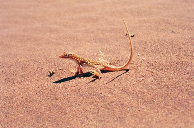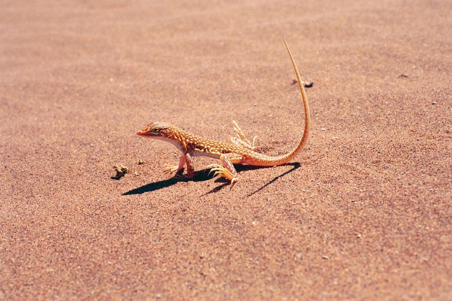 L’aporosaura è presente sulle coste sabbiose dell’Africa sudoccidentale. Di aspetto simile alla lucertola comune, si distingue da questa per il muso singolarmente schiacciato all’estremità, come a formare una spatola. Sul dorso mostra una colorazione di fondo gialla, percorsa da una retinatura irregolare più scura; le parti inferiori del corpo sono di colore biancastro. Caratteristica è anche la conformazione della coda, molto grossa in prossimità dell’attaccatura ma che si rastrema poi rapidamente fino a divenire estremamente sottile. Degne di rilievo sono la capacità dell’aporosaura di seppellirsi fulmineamente nella sabbia e la notevole rapidità con la quale è in grado di correre sulla sua superficie. Un’altra peculiarità riguarda la dieta: è l’unica lucertola a nutrirsi principalmente di semi.