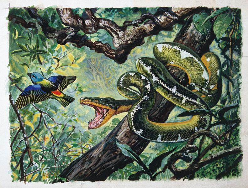 Presente in tutta la parte settentrionale dell’America Meridionale, il boa smeraldino deve il nome al suo spiccato colore verde smeraldo, che gli consente di mimetizzarsi sugli alberi delle foreste pluviali, dove abitualmente vive. Il corpo, che presenta macchie bianche sul dorso e una coloritura giallastra sul ventre, è compresso lateralmente; la testa è allungata e ben delimitata rispetto al collo; gli occhi sono piuttosto grandi. I denti, estremamente lunghi nella parte anteriore delle mascelle, si accorciano progressivamente nella parte posteriore. La coda, abbastanza breve, è prensile e dotata di notevole forza. Il boa smeraldino si nutre prevalentemente di uccelli, ma anche di piccoli mammiferi. È ovoviviparo e la femmina dà alla luce fino a 20 piccoli.