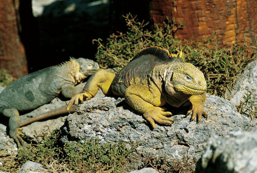 L’iguana terrestre delle Galápagos vive esclusivamente in alcune isole dell’arcipelago omonimo, dove abita ambienti aridi. Ha corpo particolarmente massiccio, coda a sezione tonda e cresta che parte dalla nuca e continua lungo il dorso. Sfoggia una livrea di colore marrone scuro superiormente e chiaro inferiormente; la testa è giallastra. L’iguana terrestre delle Galápagos si nutre di vegetali, soprattutto dei frutti dei cactus del genere Opuntia. Durante la stagione degli amori i maschi combattono tra loro, e a iniziare la lotta è sempre il maschio che si introduce nel territorio altrui. La femmina depone 25 uova in una buca scavata nella sabbia umida o sotto le foglie a terra, talvolta dopo aver percorso anche più di 10 chilometri alla ricerca del luogo ideale. Alla stessa famiglia appartiene Ctenosaura hemilopha, che vive in Messico, nelle zone semiaride della Penisola di California e in alcune isole del Golfo di California. Ha corporatura robusta ed è ricoperta di squamette lisce nella parte anteriore; nella parte caudale le squame sono assai più sviluppate e presentano un rilievo acuminato. La livrea è verde tendente al giallo negli individui giovani, grigio-verdastro con disegni a V neri negli adulti. È una specie arboricola ed erbivora. Il genere Ctenosaura comprende alcune specie in pericolo di estinzione.
