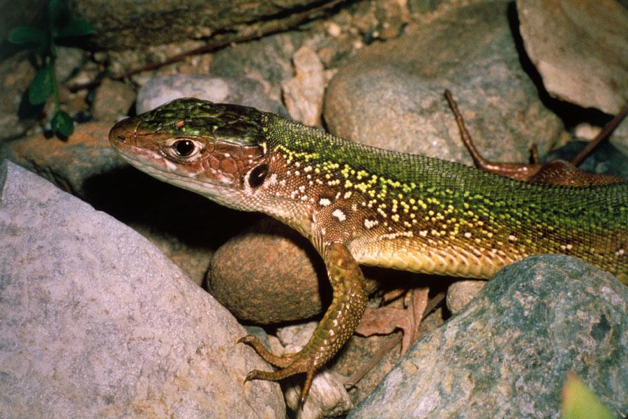 Il ramarro occidentale è presente dalla Galizia alla Francia centromeridionale, dalla Germania sudoccidentale fino alla Svizzera e all’Italia (tranne in Sardegna), dove vive dal livello del mare fino a 1500 metri di quota ai margini di aree boscate, talvolta in prossimità dei centri abitati. Si distingue dal ramarro vero e proprio per il colore della gola negli individui appena nati: verde-azzurro nel ramarro occidentale, brunastro nel ramarro. I maschi sono verdi, con punteggiatura nera sul dorso, e presentano una colorazione blu sulla gola, molto intensa nella stagione riproduttiva. Le femmine hanno una colorazione variabile, tendente al bruno, talvolta con una coppia di linee biancastre sopra gli occhi. Il ramarro occidentale si ciba per lo più di insetti, ma non disdegna ragni, piccoli sauri, uova di uccelli e, occasionalmente, bacche e frutti. La femmina depone, sotto le pietre o in una buca, fino a 20 uova, che si schiudono dopo 60 giorni.
