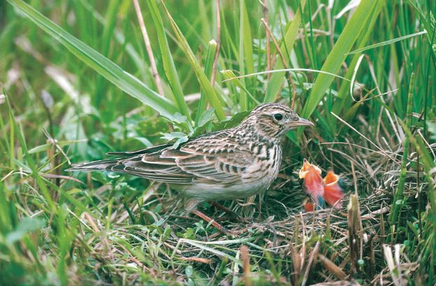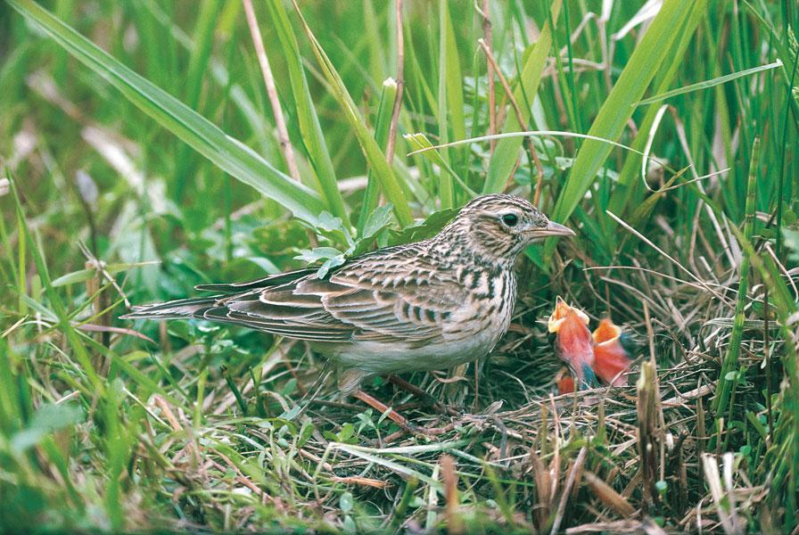 Specie migratrice, sedentaria e dispersiva, l’allodola è presente in Eurasia – tranne che in Islanda – e in Africa nordoccidentale. In Italia è molto comune e arriva anche oltre i 2500 metri di altitudine. Di forme allungate, veste un abito mimetico bruno-fulvo macchiato e striato di scuro; il sopracciglio è biancastro. Possiede un ciuffo occipitale che si fa eretto ed evidente quando l’uccello è agitato; le timoniere esterne bianche sono ben visibili in volo. L’apertura alare misura 30-36 centimetri. L’allodola si adatta a vivere in vari tipi di ambienti aperti, erbosi, incolti o intensamente coltivati; occasionalmente si trova anche in dune sabbiose. La meccanizzazione agricola e l’uso dei pesticidi ne hanno ridotto le popolazioni. L’allodola si nutre sia di animali sia di vegetali. Nidifica al suolo, tra la vegetazione; da fine marzo la femmina depone 3-5 uova biancastre fittamente macchiate di scuro; la schiusa avviene dopo 11 giorni e l’involo dopo altri 18-20. Nel periodo riproduttivo i maschi si esibiscono con decolli dal suolo con traiettoria a spirale. Tra le altre allodole, l’allodola golagialla (Eremophila alpestris) si riconosce per il capo giallo o biancastro ornato da cornetti neri. Diffusa in Eurasia, Nordafrica e America Settentrionale, in Italia è presente come migratrice scarsa e irregolare. L’allodola (o lodola) dal becco curvo (Alaemon alaudipes) vive nelle zone desertiche africane e asiatiche; si serve del becco allungato e ricurvo per ricercare le larve nel terreno. Nei deserti vive anche Ammomanes deserti, che ha livrea color sabbia sulle parti superiori e grigio-rosata su quelle inferiori; la coda è bruno-rossastra con banda nera.