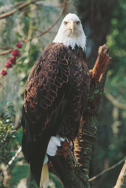 Detta anche aquila calva, l’aquila di mare testabianca è presente nell’America settentrionale e vive nelle foreste e sulle montagne, sempre nelle vicinanze di laghi o mari. Coperta da un piumaggio bruno che contrasta con il bianco della testa e della coda e con il giallo delle zampe e del vistoso becco, raggiunge un’apertura alare di 2,3 metri e ha poderosi artigli con i quali cattura e trafigge le prede dopo averle avvistate dall’alto. La sua dieta è principalmente a base di pesci, soprattutto salmoni, ma gradisce anche piccoli mammiferi come conigli, uccelli marini e persino carogne; non è insolito che arrivi a rubare le prede ad altri rapaci. Le femmine depongono 1-3 uova e le covano per 5-6 settimane. Alla schiusa i piccoli sono coperti di piumino bianco e, poiché non sono in grado di volare e di procurarsi il cibo da soli, i genitori li imbeccano con pesci e altri piccoli animali fino a quando, dopo circa 3 mesi, cominciano a volare e diventano indipendenti. L’aquila di mare testabianca è nota anche per essere il simbolo degli Stati Uniti.