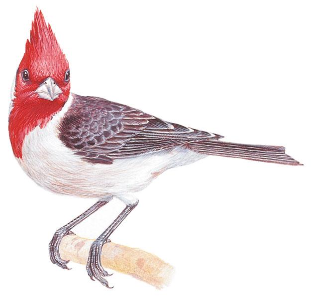 Il cardinale rosso è presente dal Canada meridionale all’America Centrale, ed è stato introdotto in California e nelle isole Hawaii e Bermuda. Il suo areale originario si è esteso notevolmente a partire dall’Ottocento, soprattutto negli abitati, in quanto il suo aspetto colorato e attraente lo rende bene accetto all’uomo. In natura il cardinale rosso frequenta i margini dei boschi e le zone con radi alberi, ma in genere costruisce il nido nel fitto della vegetazione. Il piumaggio del maschio, di un vivo colore scarlatto, forma sul capo una cresta evidente; sulla faccia presenta una mascherina nera; la femmina è di color marroncino o verdognolo chiaro ed è priva di mascherina. Il becco è conico, robusto, di colore aranciato. L’alimentazione comprende cereali, semi di vario genere, frutti e insetti. Di norma il cardinale rosso effettua 2 covate all’anno, tra marzo e luglio. La femmina depone 3-4 uova biancastre o verdognole, che cova per 11-13 giorni; l’involo avviene intorno al decimo giorno di vita.