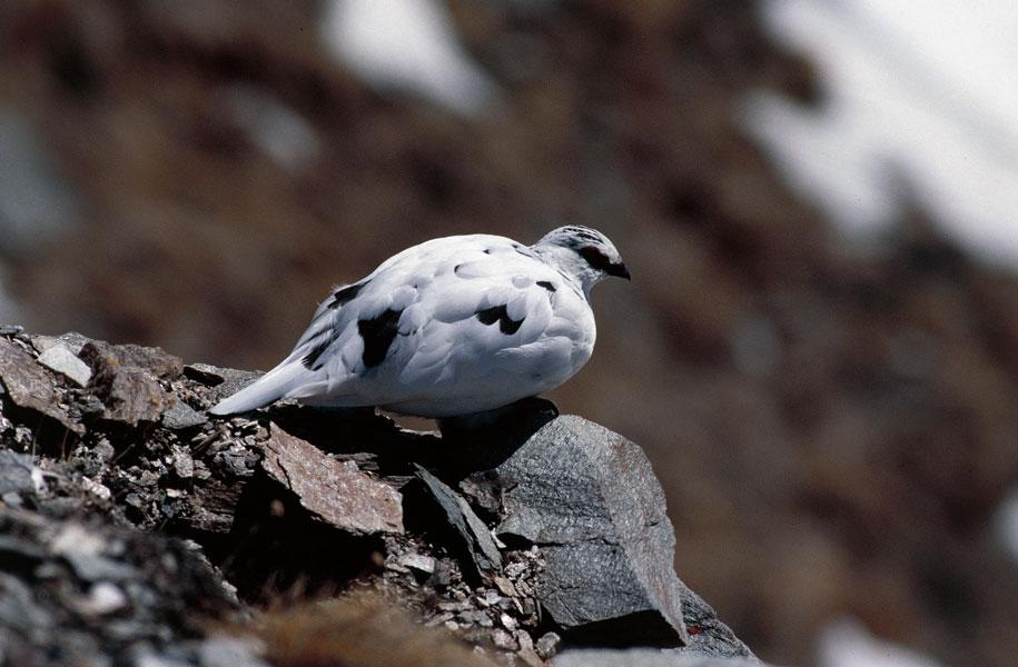 La pernice bianca è un uccello sedentario presente in Eurasia e nell’America Settentrionale. In Europa nidifica nei Paesi più a nord e sui massicci montuosi meridionali, dove è rimasta “intrappolata” nel corso dell’ultima glaciazione, risalente al Quaternario. Predilige la brughiera e la tundra, dai 200 metri in Scozia e intorno ai 2700 metri sulle Alpi; in Italia nidifica lungo tutto l’arco alpino. Dotata di un’apertura alare di 54-60 centimetri, ha becco breve e zampe ricoperte di piume. Mirabilmente adattata alla vita delle alte quote, cambia l’abito ad ogni stagione, così da mantenersi sempre mimetica rispetto all’ambiente, che si tratti di vegetazione prostrata, di pietraie o di neve. La livrea estiva tende al bruno-nerastro o al bruno-rossastro, con striature nere e grigiastre; quella invernale è di un bianco candido, ad esclusione delle timoniere e di uno stretto spazio scuro attorno agli occhi dei maschi. Gregaria in autunno e inverno, la pernice bianca forma coppie monogame durante il periodo della riproduzione; tra maggio e luglio la femmina depone 5-8 uova, che si schiudono dopo una ventina di giorni. Caratteristico il richiamo rauco e gutturale, udibile a notevole distanza.