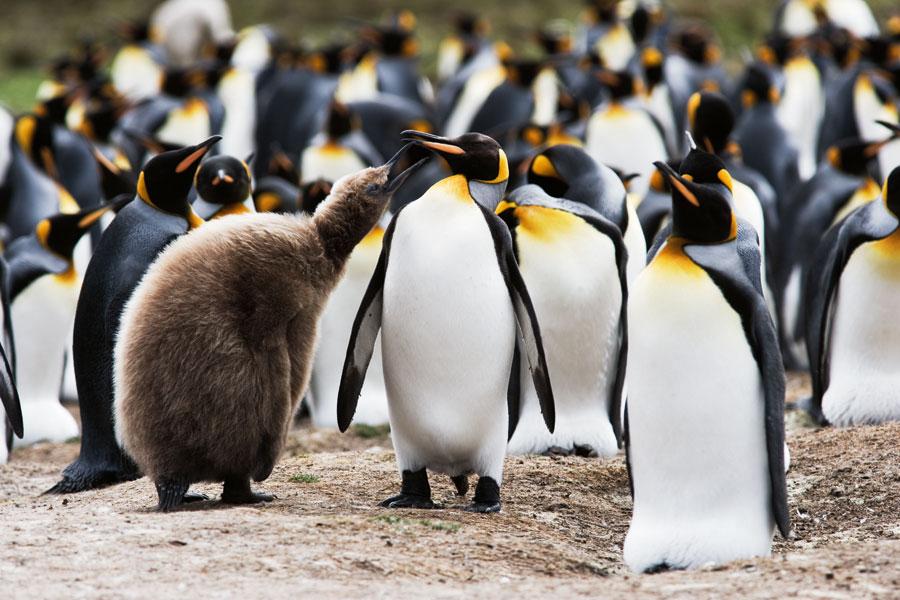Insieme al pinguino imperatore, il pinguino reale è la specie di maggiori dimensioni della famiglia. È presente sulle coste brulle e piatte di Patagonia, Georgia del Sud, isole Falkland e altri arcipelaghi prossimi al margine occidentale dell’Antartide. Ha becco lungo, sottile e lievemente ricurvo verso il basso, zampe ricoperte di piume fino all’attacco delle dita – munite di unghie ben sviluppate – e coda ridottissima. Il piumaggio è nero sul capo, sulla nuca e sulla gola, mentre in corrispondenza della regione delle orecchie, sul collo e su parte del petto è di un bel colore giallo; per il resto è grigio nelle regioni superiori del corpo, bianco in quelle inferiori. Il becco è nero e rosso, le zampe sono brune. Dotato di spessi depositi adiposi sottocutanei, il pinguino reale può galleggiare quasi senza compiere movimenti; nel nuoto è velocissimo, e compie frequenti immersioni alla ricerca di pesci e altri organismi marini di cui si nutre. Ha abitudini sia acquatiche sia terrestri: vive in enormi colonie e trascorre la maggior parte del tempo in acqua, mentre per riprodursi si sposta nell’entroterra. Fra maggio e giugno la femmina depone un unico uovo, che i genitori covano a turno. Il piccolo viene alla luce dopo poco più di 2 mesi, nel pieno dell’inverno antartico; data la termoregolazione ancora imperfetta, viene protetto fra i piedi e il ventre dei genitori fino alla fine dell’inverno; a 5 mesi è pronto per entrare in mare e iniziare la vita adulta.