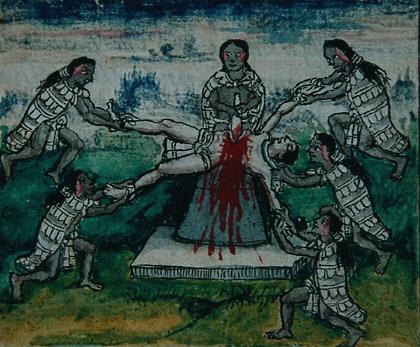 La vittima di alto rango veniva invece portata al Tempio di Huitzilopochtli o a quello di Xipe Tótec, il “dio scorticato”, Signore della vegetazione e della rinascita. Qui il prigioniero veniva legato a una pietra sacrificale ed era costretto a combattere con armi spuntate contro guerrieri armati di tutto punto. Gli veniva quindi aperto il torace con un coltello di ossidiana, strappato il cuore, poi bruciato, e il suo sangue era sparso sui gradini del tempio. La pelle scuoiata della vittima veniva indossata da un sacerdote e infine seppellita ai piedi della piramide. I sacrifici dei bambini erano invece dedicati al dio della Pioggia Tlaloc: i maschi venivano uccisi sulle montagne vicine alla città e la statua del dio dipinta con il loro sangue, mentre le femmine, vestite d’azzurro, venivano sgozzate e gettate nelle acque del Lago Texcoco.