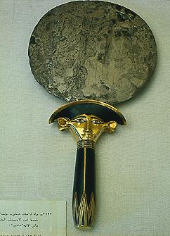Gli antichi specchi egizi giunti fino ai nostri giorni consistono in dischi metallici, generalmente in bronzo. Ce n'erano anche in rame, in argento e persino in lega metallica. Di forma piatta, venivano lucidati e puliti con cura. Ad essi era unito un manico che poteva avere forma di colonnina, di figura femminile o di una divinità. Gli specchi metallici erano molto costosi ed è probabile che fossero esclusivamente destinati alle classi sociali alte. Le persone meno abbienti dovevano accontentarsi di vedere il proprio volto riflesso nell'acqua. È noto che gli egizi non conobbero lo specchio di stagno almeno fino all'epoca cristiana. Gli specchi avevano anche una funzione religiosa e funeraria: erano elementi di culto, usati come offerte alle dee Mut e Hathor. Grazie alla loro forma e lucentezza, gli specchi erano in rapporto con il dio solare, tanto da essere considerati simboli della rigenerazione e della vita.