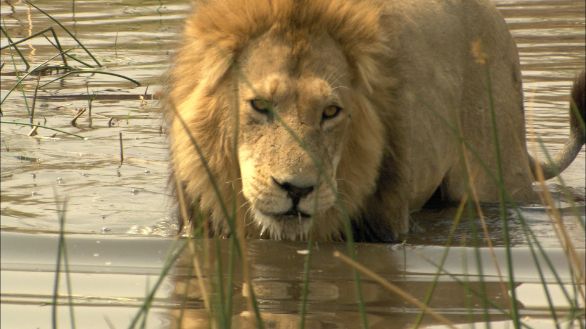Leone nello stagno Un leone ritratto nel momento in cui abbevera